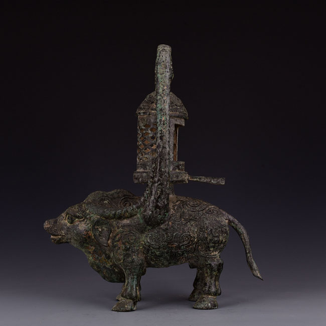 湖南省博物館的西漢牛形燈,燈為牛形,兩角沿背的兩側(cè)以圓管狀向上豎立,并會(huì)合為一,向下擴(kuò)大為覆碗狀,作為出煙管。牛腹中空可盛水,點(diǎn)燃時(shí)煙可通過腹中,以保持室內(nèi)空氣清潔,側(cè)有銘文十字,為當(dāng)時(shí)長沙王劉發(fā)或其后代宗廟用器。